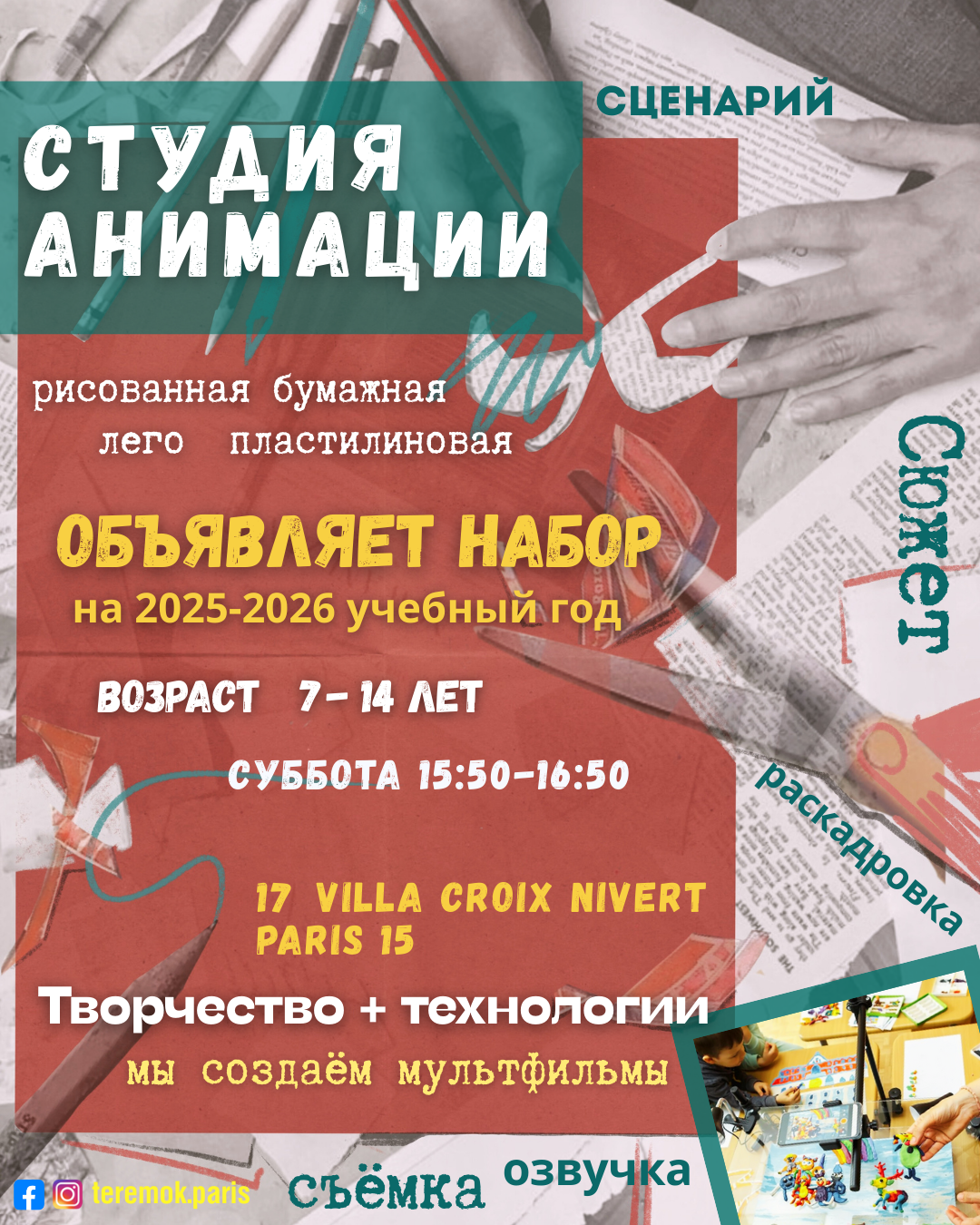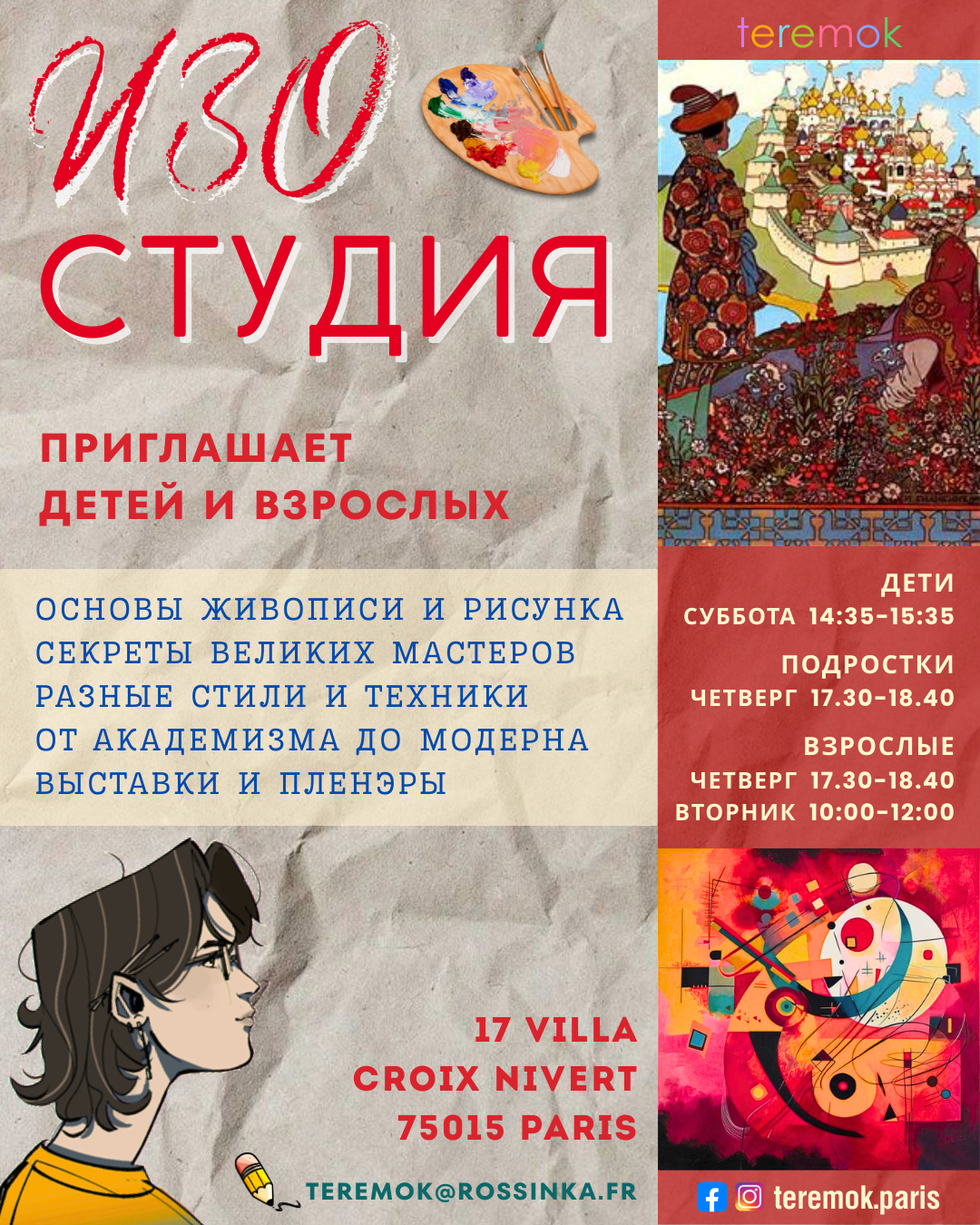 Мы рады пригласить ребят от 5 лет на новые интересные студии в субботу после обеда в нашем новом помещении : 17 villa croix Nivert, 75015.