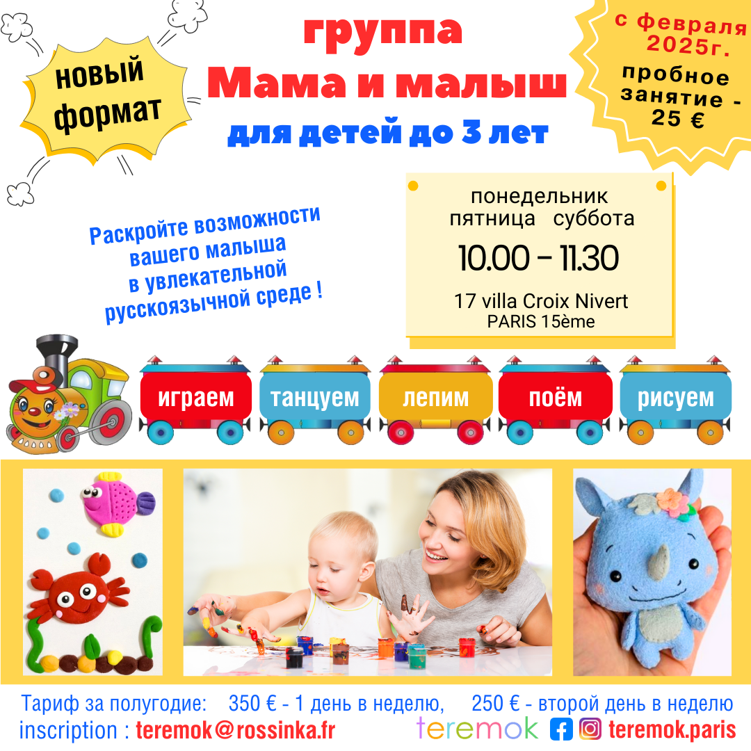Новые форматы в группе МАМА и МАЛЫШ — февраль 2025 - Oksana Monnier · 03/02/2025 Приглашаем малышей до 3 лет на наши новые форматы в группу МАМА и МАЛЫШ! Занятия по понедельникам, пятницам с субботам в 10:00-11:30 в Париже в 15-м районе: 17 villa Croix Nivert, 75015. Для записи заполните форму внизу или отправьте нам мэйл: teremok@rossinka.fr Ваше имя (обязательно) Ваш e-mail (обязательно) Ваш телефон (обязательно) Дата рождения ребенка (обязательно) Ваше сообщение Эта форма отправляет электронное письмо. На сайте данные не регистрируются. Пожалуйста, заполните все обязательные поля Δ