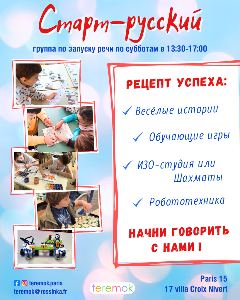 Для записи заполните форму внизу или отправьте нам мэйл: teremok@rossinka.fr.