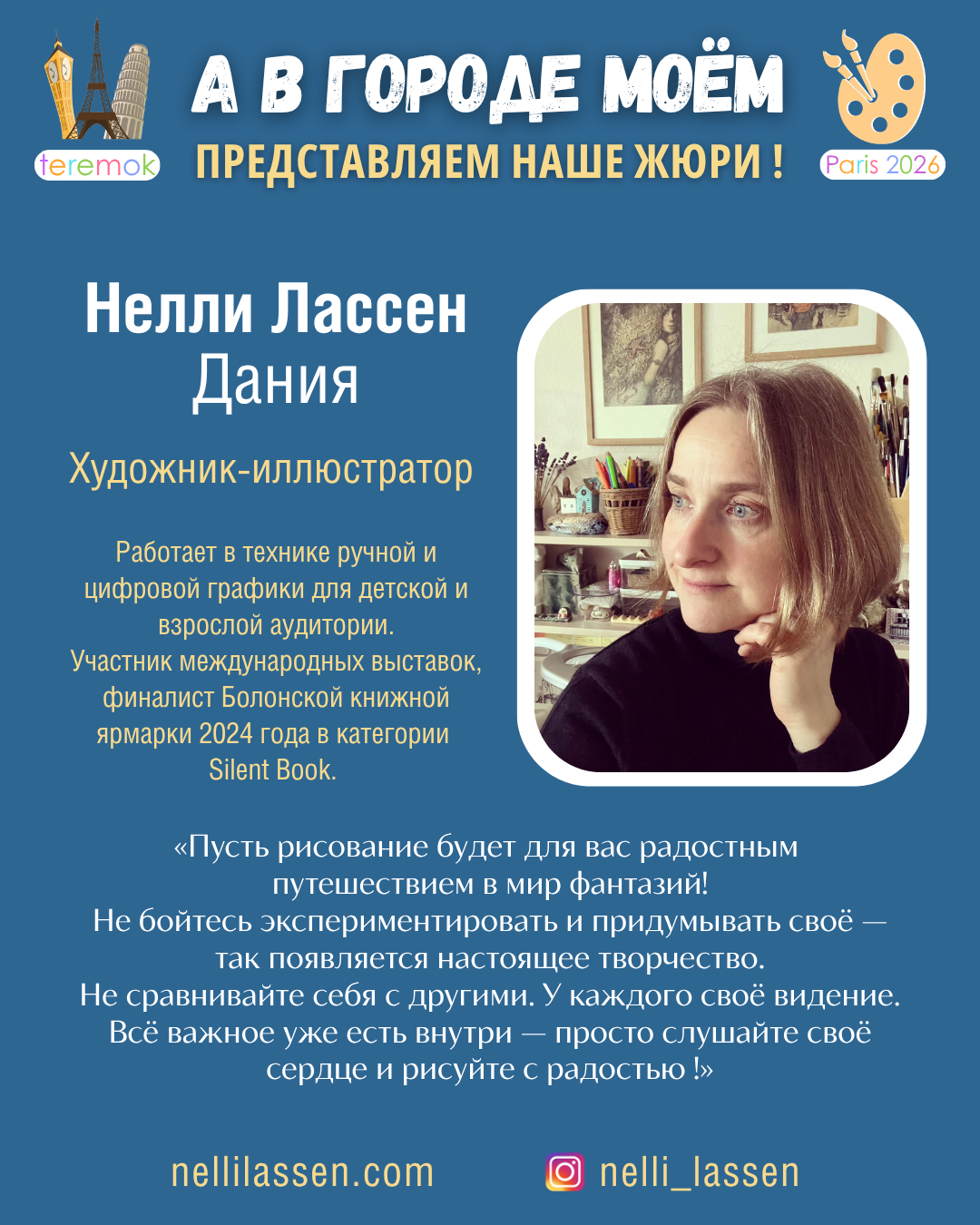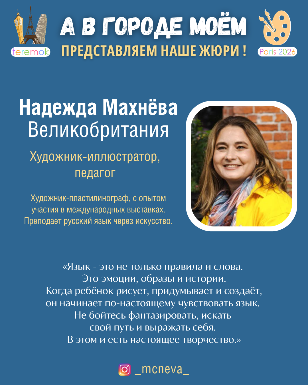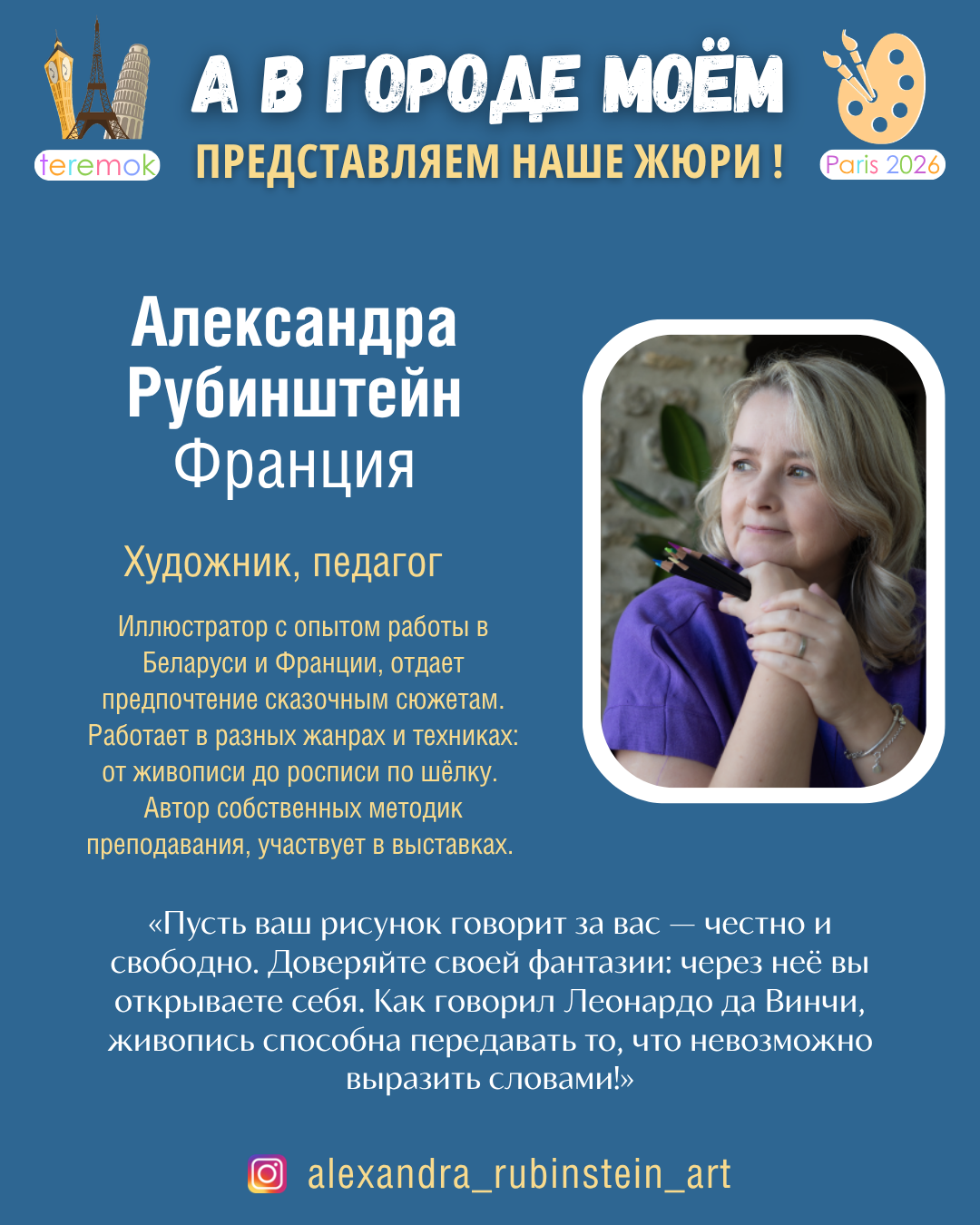 - Alexandra Rubinstein, peintre et pédagogue, membre de rédaction de magazines pour enfants «Sverchok», France – Instagram, Threads